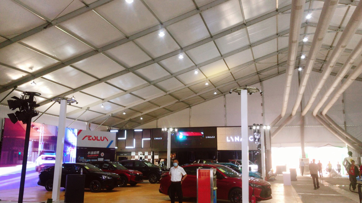 在一些車展、汽車發布會上,往往就會應用到裝配式篷房建筑。使用篷房的好處很明顯:利用篷房內部空間無立柱的特性,無死角對汽車進行展示;使用篷房與定制化廣告牌、廣告板、特殊品牌標志、燈光效果相結合,營造出驚艷的視覺效果;在銷售區、餐飲區、醫療保障區搭建篷房,解決功能性空間不足的問題。