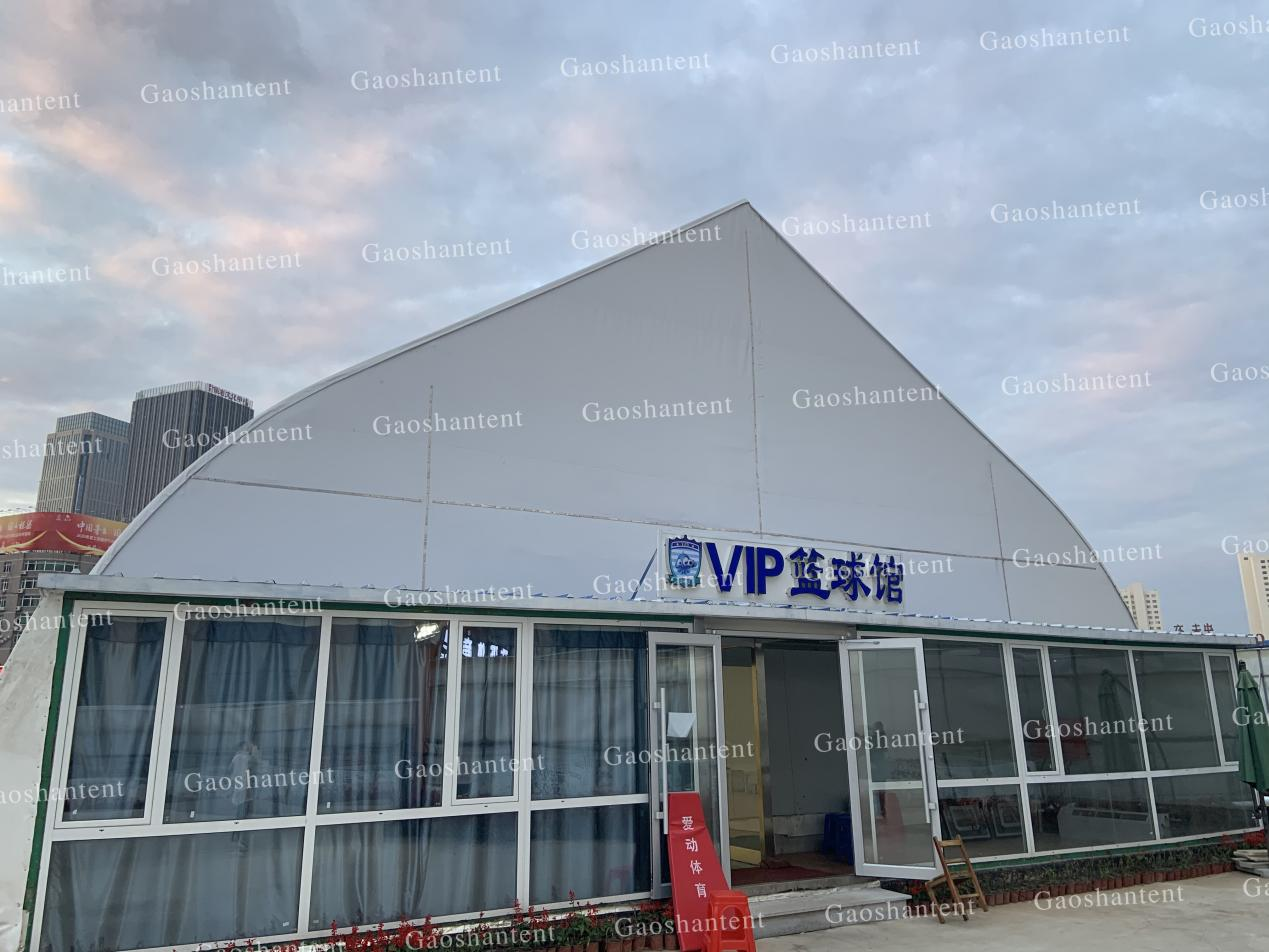 這種體育館是篷房建筑,在性質上屬于臨時建筑,所以搭建手續審批很方便。篷房主要包括鋁合金框架和PVC篷布兩部分組成,而且這兩部分都在篷房工廠生產,直接運輸到施工現場,進行搭建即可,不會對周邊造成聲音污染和環境污染。