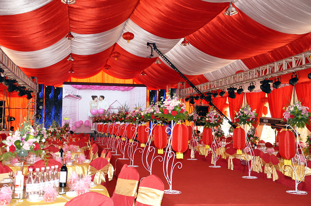 篷房婚禮主體由鋁合金或鋼鐵及篷布組成,可依需求設計個性篷房,外觀典雅,并可搭配設施(硬體墻、高隔斷、頂幔、邊幔、地板、家具、燈飾、空調、冷風機、加熱設備……),和酒店一樣舉行婚禮和酒會!